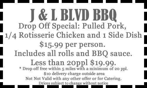 Pulled pork, ¼ rotisserie chicken and 1 side dish. $15.99 per person. Includes all rolls and bbq sauce. Less than 20ppl $19.99.Drop off free within 5 miles, with a minimum of 20 ppl. Choose 1 side: Mac and Cheese, Baked Beans, Fresh Slaw, Potato Salad, Potato Explosions (add .99 per person), Cornbread.